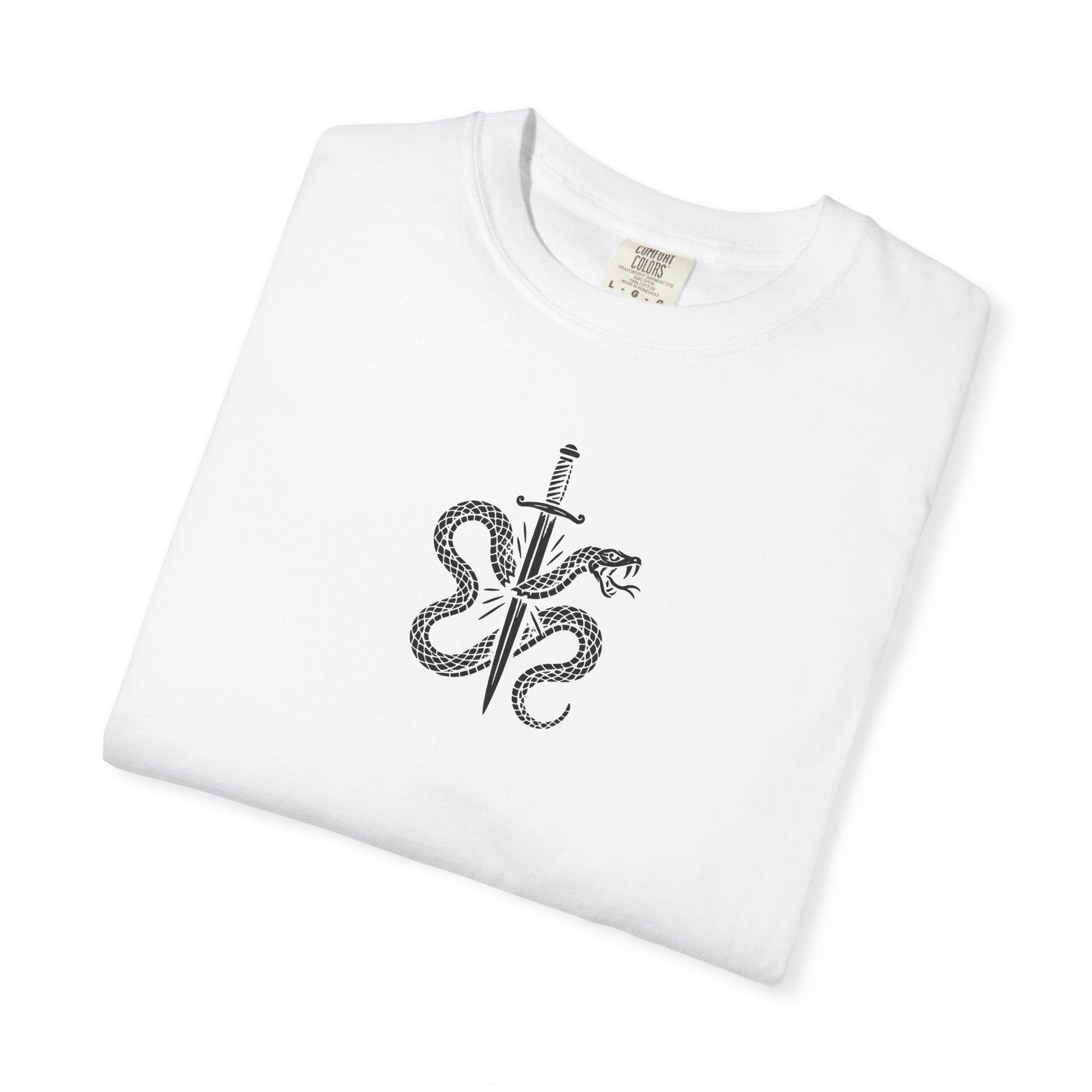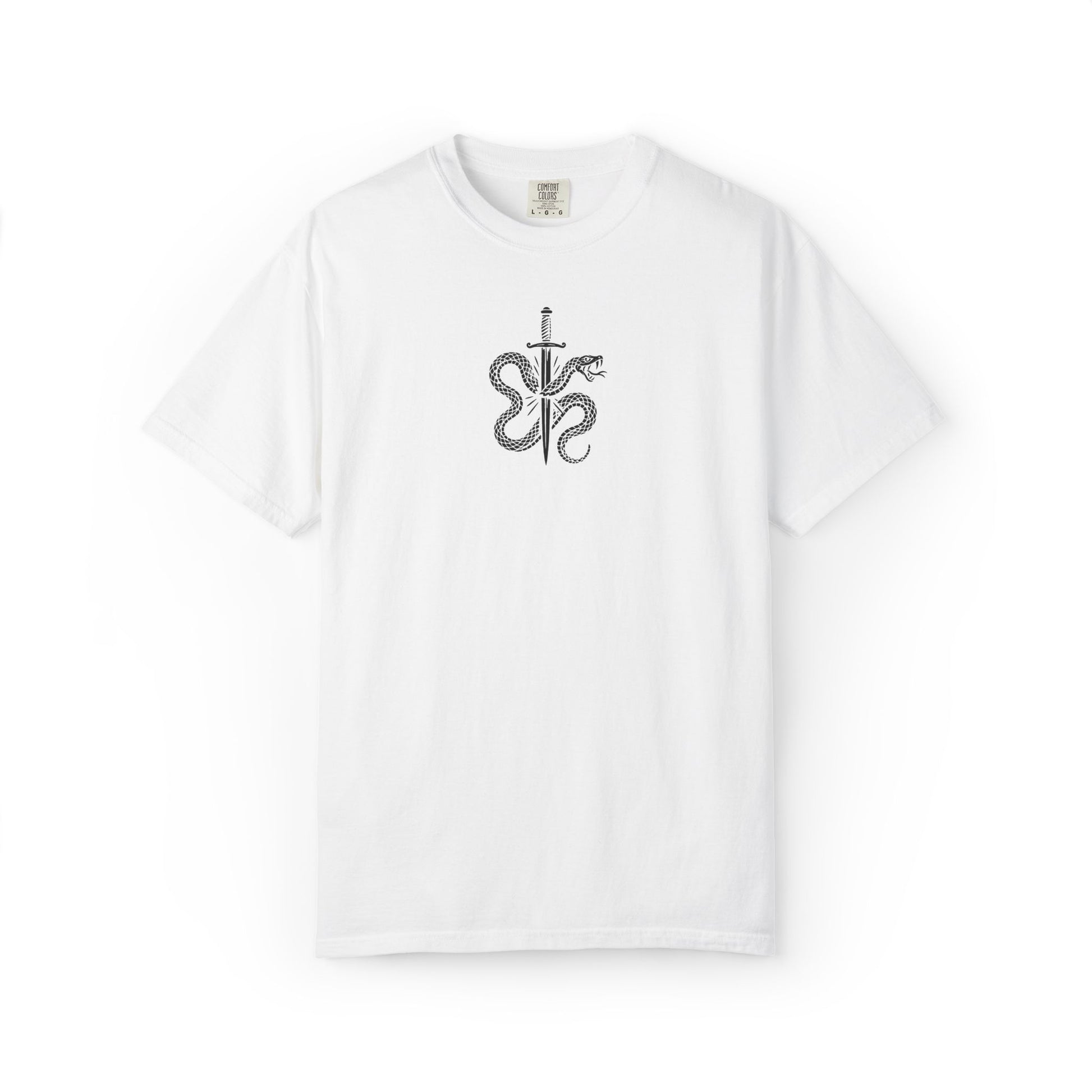 This heavyweight garment-dyed tee feels lived-in from the first wear. The relaxed cut and thick 100% ring-spun cotton give a grounded, steady presence — the kind of shirt you reach for when you want to make a quiet statement. The front carries a small, detailed dagger-and-serpent emblem; the back delivers bold, typographic messaging with layered letterforms that read like a manifesto. Wear it to shows, late-night hangs, or when you want your style to be intentionally seen without shouting. The soft, garment-dyed finish softens the color and texture so the shirt breaks in beautifully over time, developing a personal patina with every wash.